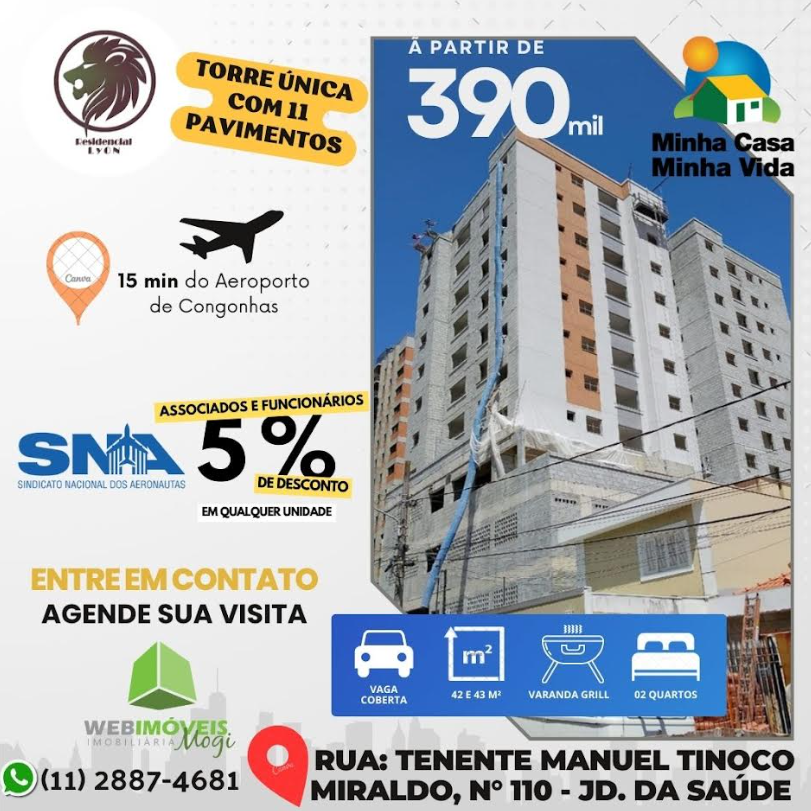 A WEB IMÓVEIS MOGI, imobiliária, em convênio com o SINDICATO NACIONAL DOS AERONAUTAS, convida todos os associados e funcionários a conhecer o Residencial Lyon. Localizado a 15 minutos do Aeroporto de Congonhas e ao lado da futura estação Abraão de Morais (linha rosa do metrô), o Residencial Lyon é uma excelente oportunidade para morar ou investir. Por meio deste convênio, oferecemos 5% de desconto na aquisição de qualquer unidade, além de entrada facilitada durante as obras.